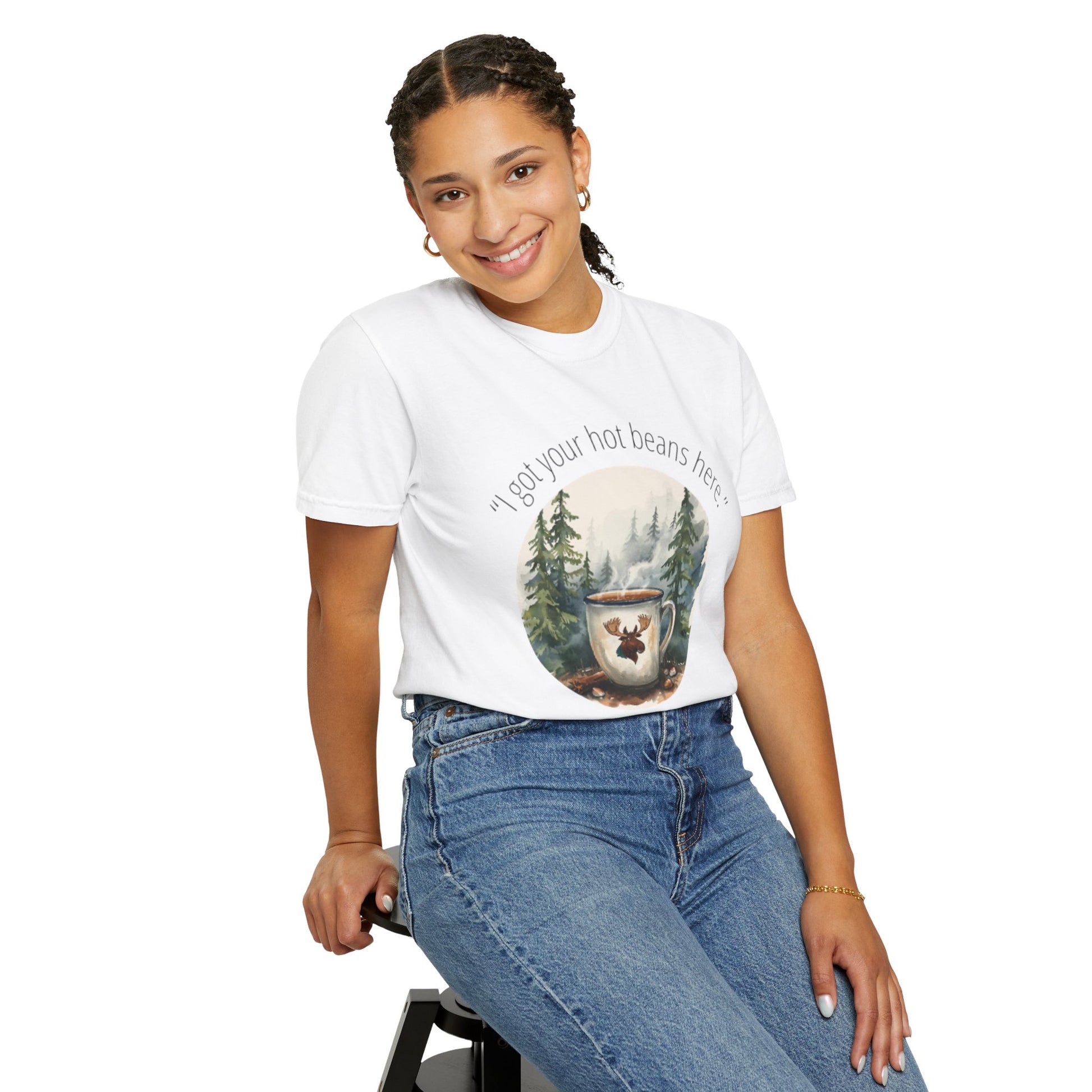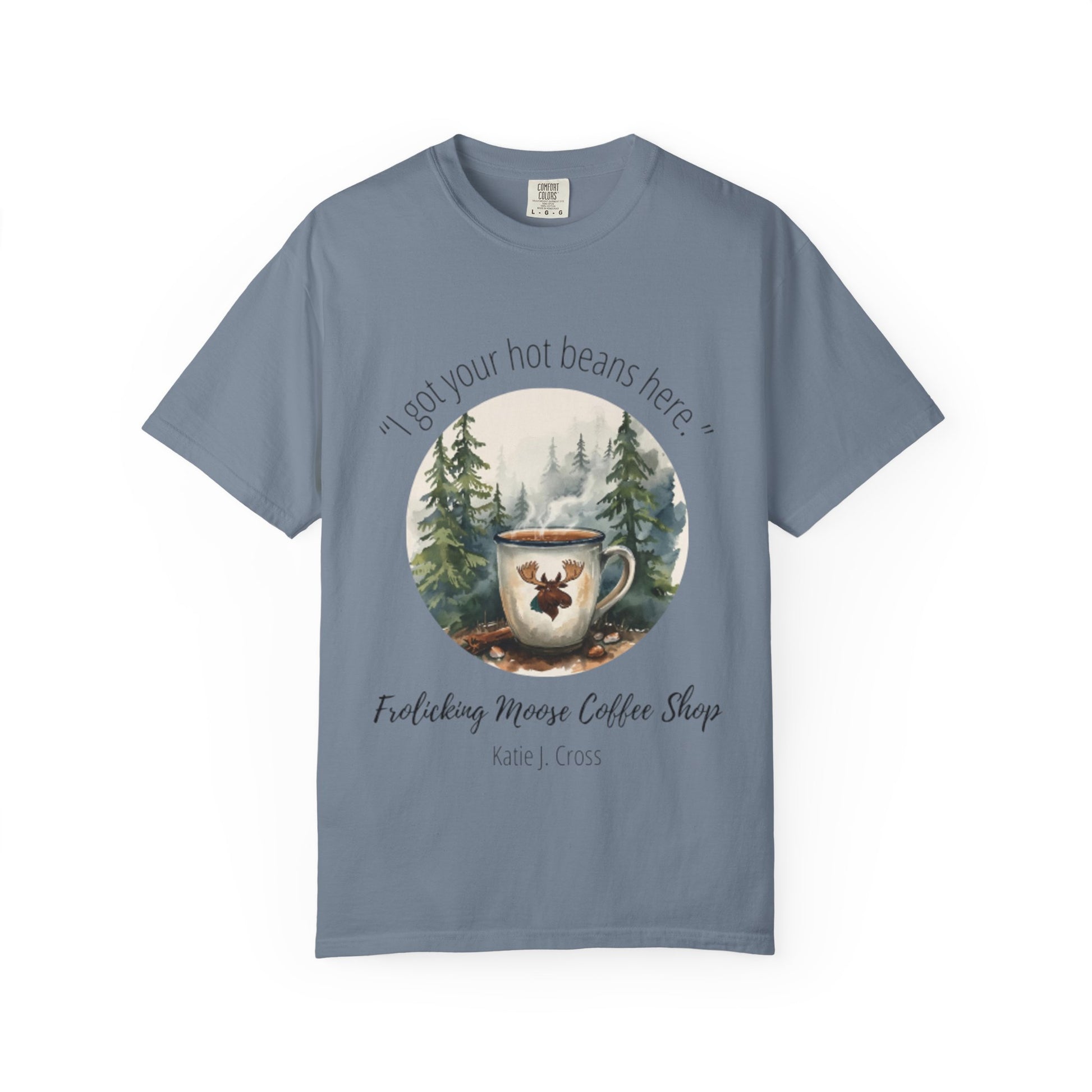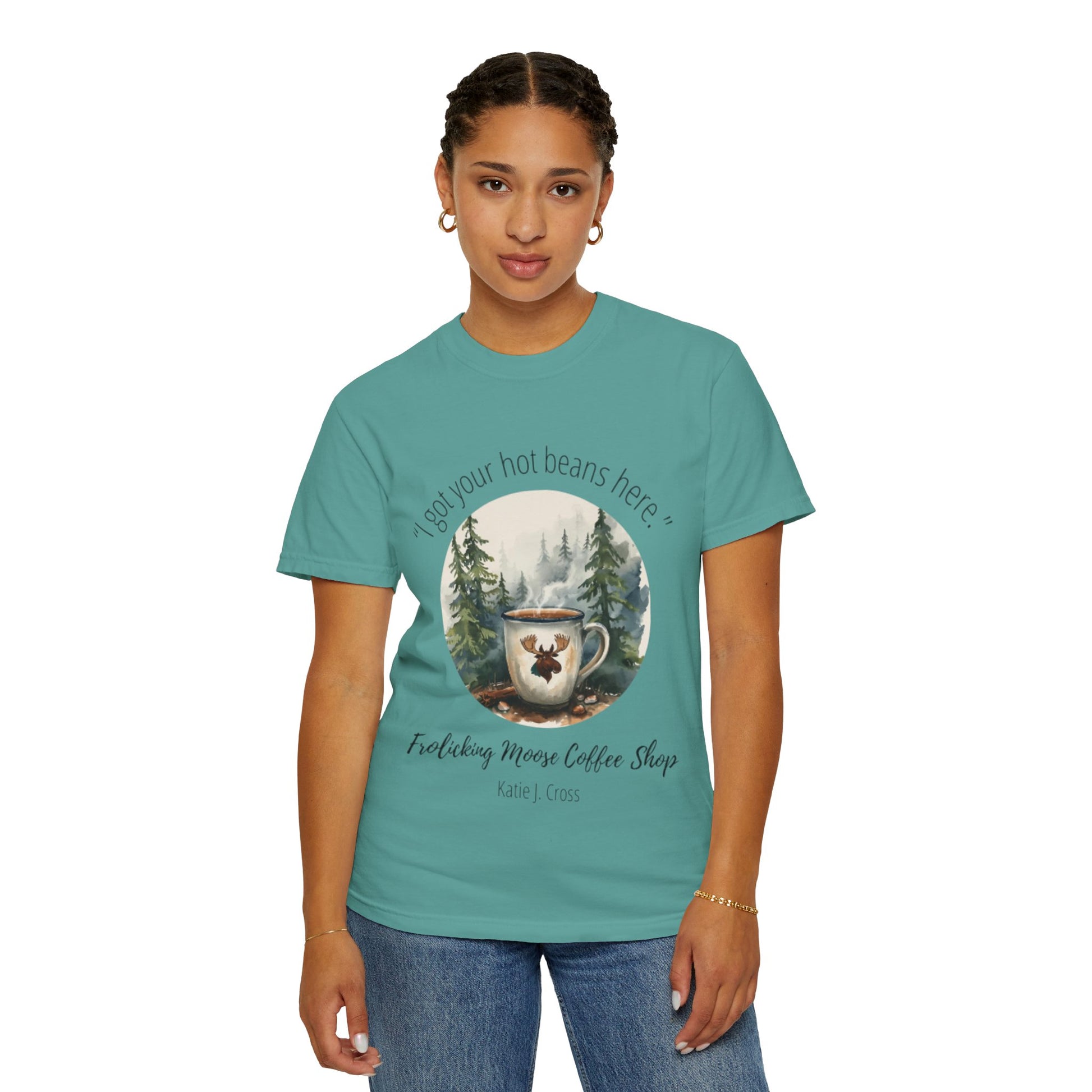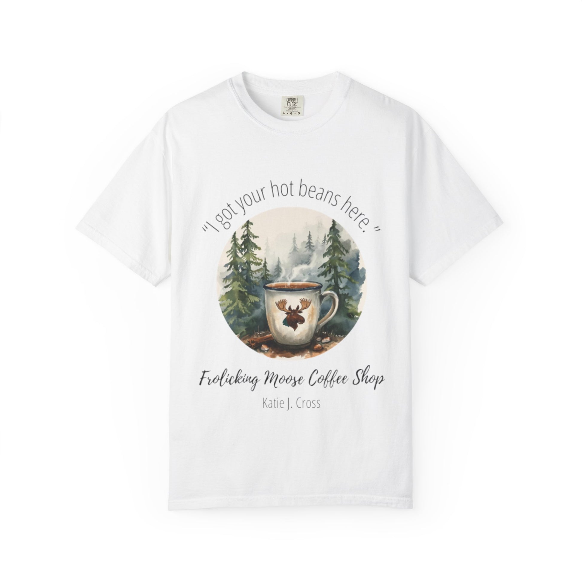 Frolicking Moose Coffee Shop T-Shirt — "I got your hot beans here"